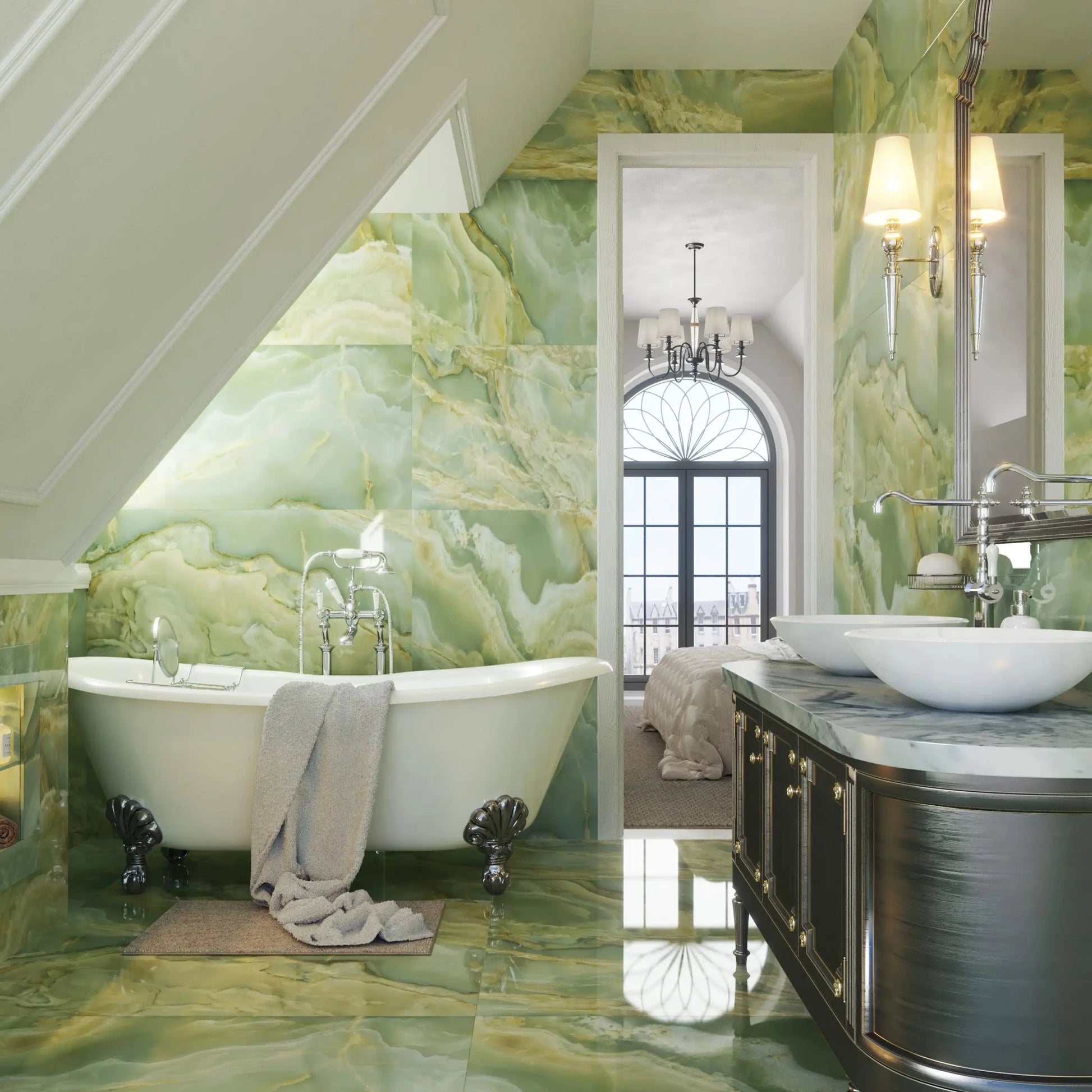 AVA Onice Iride Giada Sage Green Marble is one of the best examples of the timelessness of marble design. The beauty and smoothness of these tiles are unparalleled, and even small amounts can make a huge impact.
